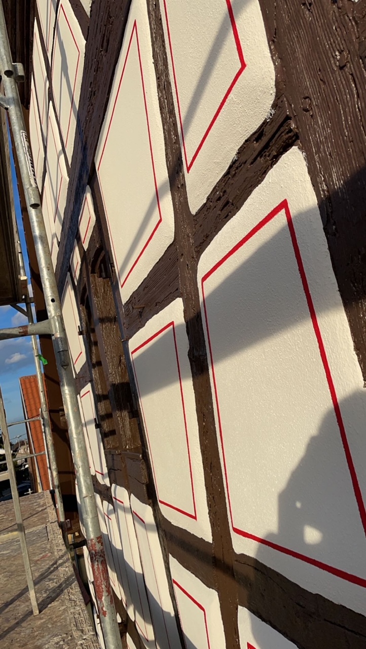 Pour cela, nous avons travaillé avec minutie sur les colombages et les créations de filet en peinture rouge qui ornent la façade. Nous avons utilisé des techniques de peinture spécifiques pour obtenir une finition de qualité et un rendu optimal.