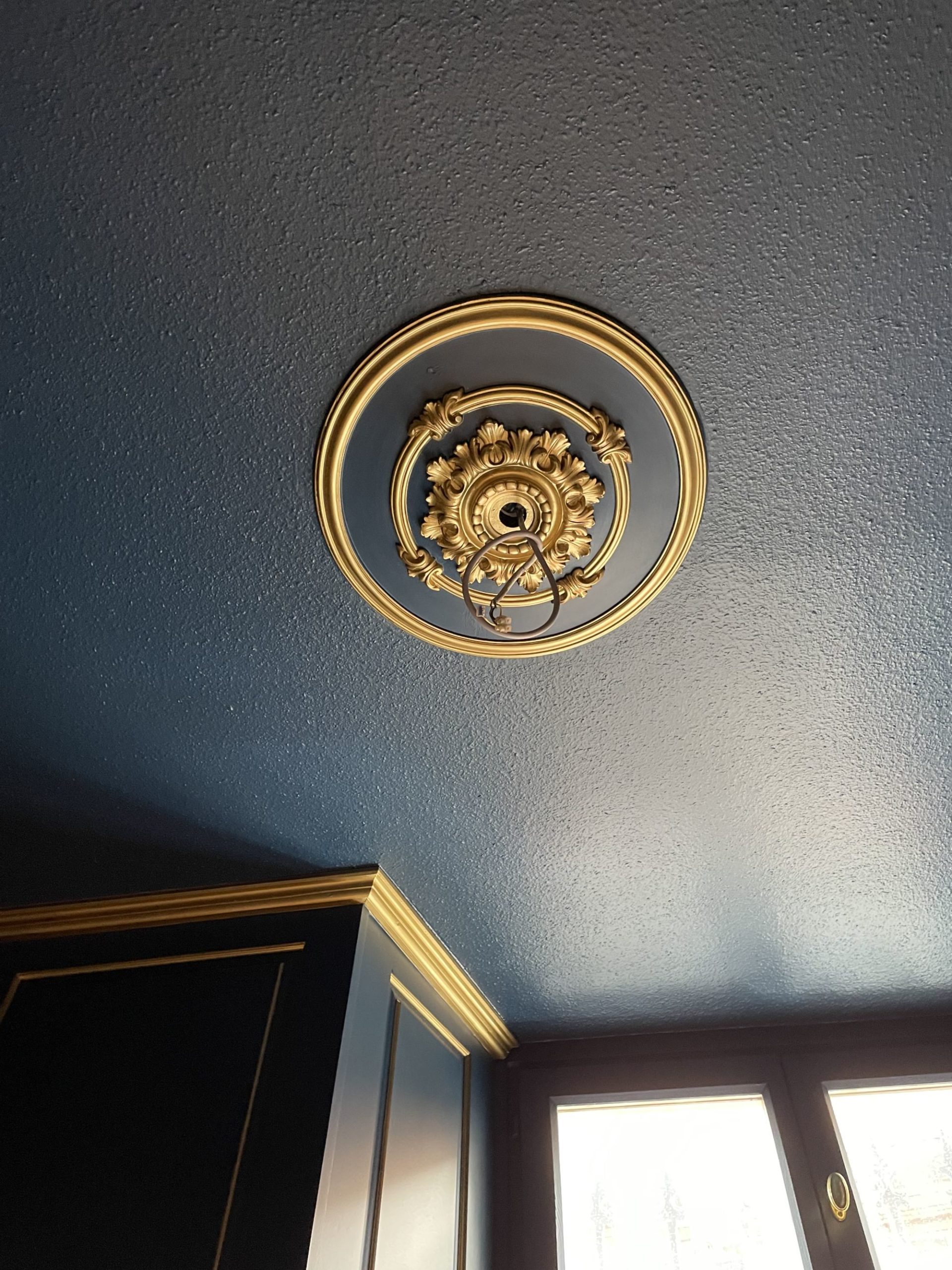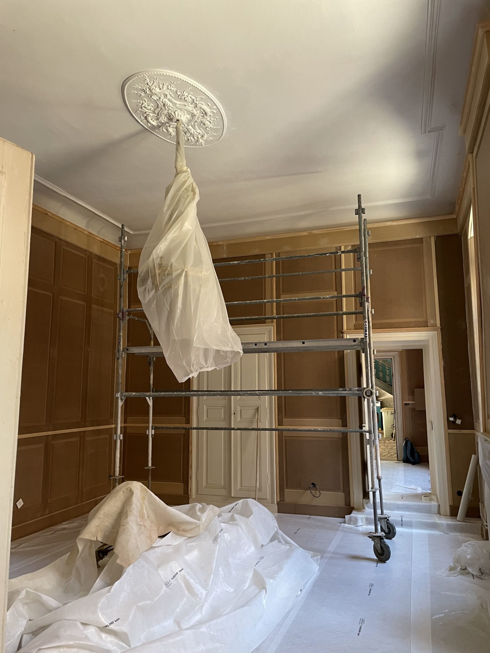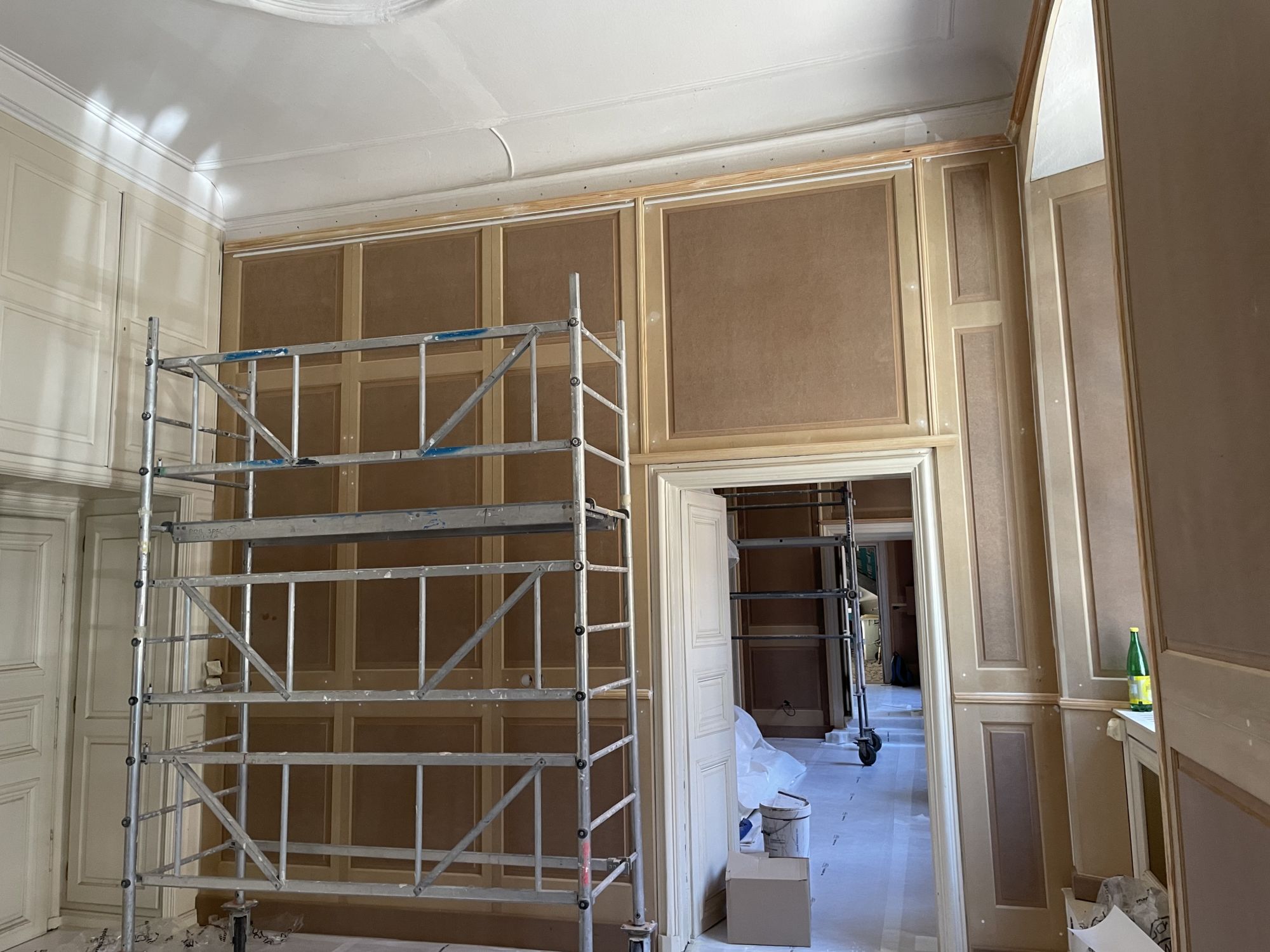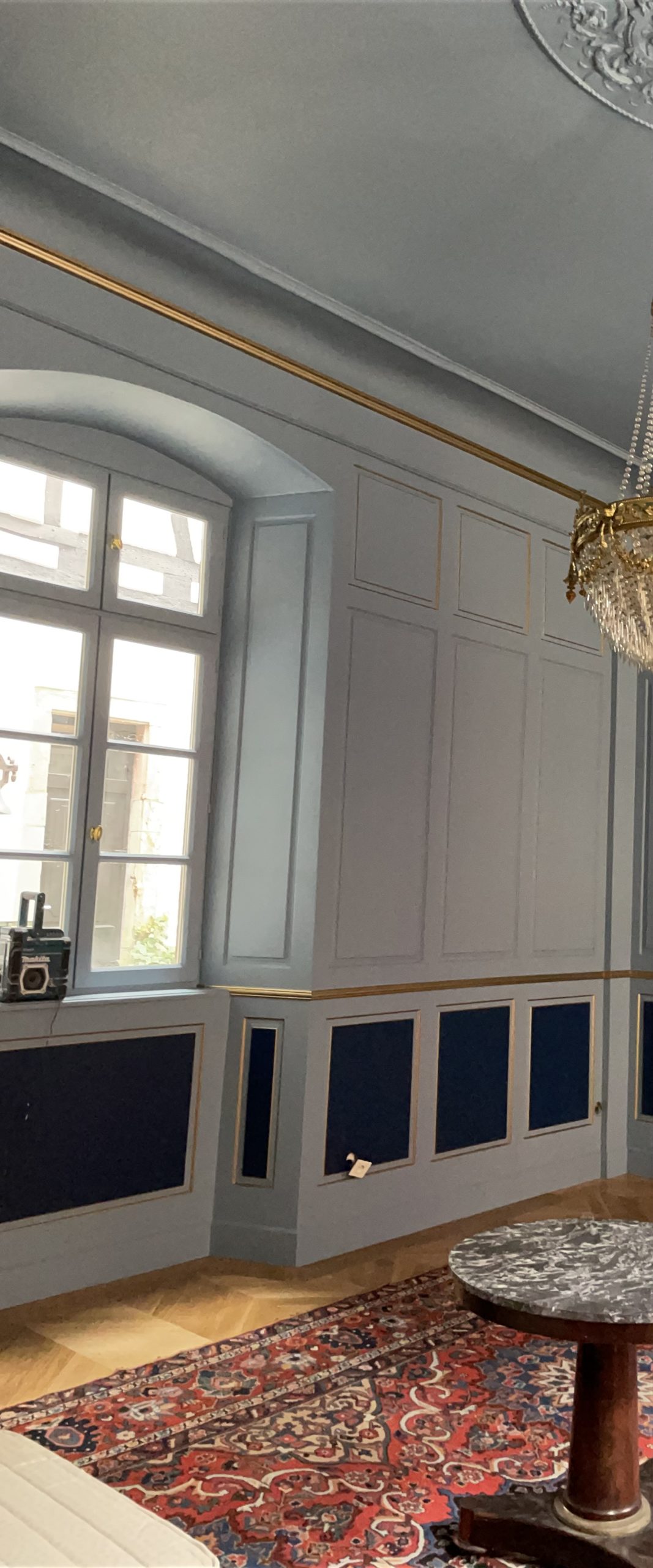 Nous avons fait de même sur le plafond : application d’une peinture bleue en finition avec dorure sur moulure.